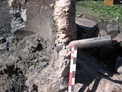 Several shots showing the placement of the tuyure and its inlet for air inside the smelter.